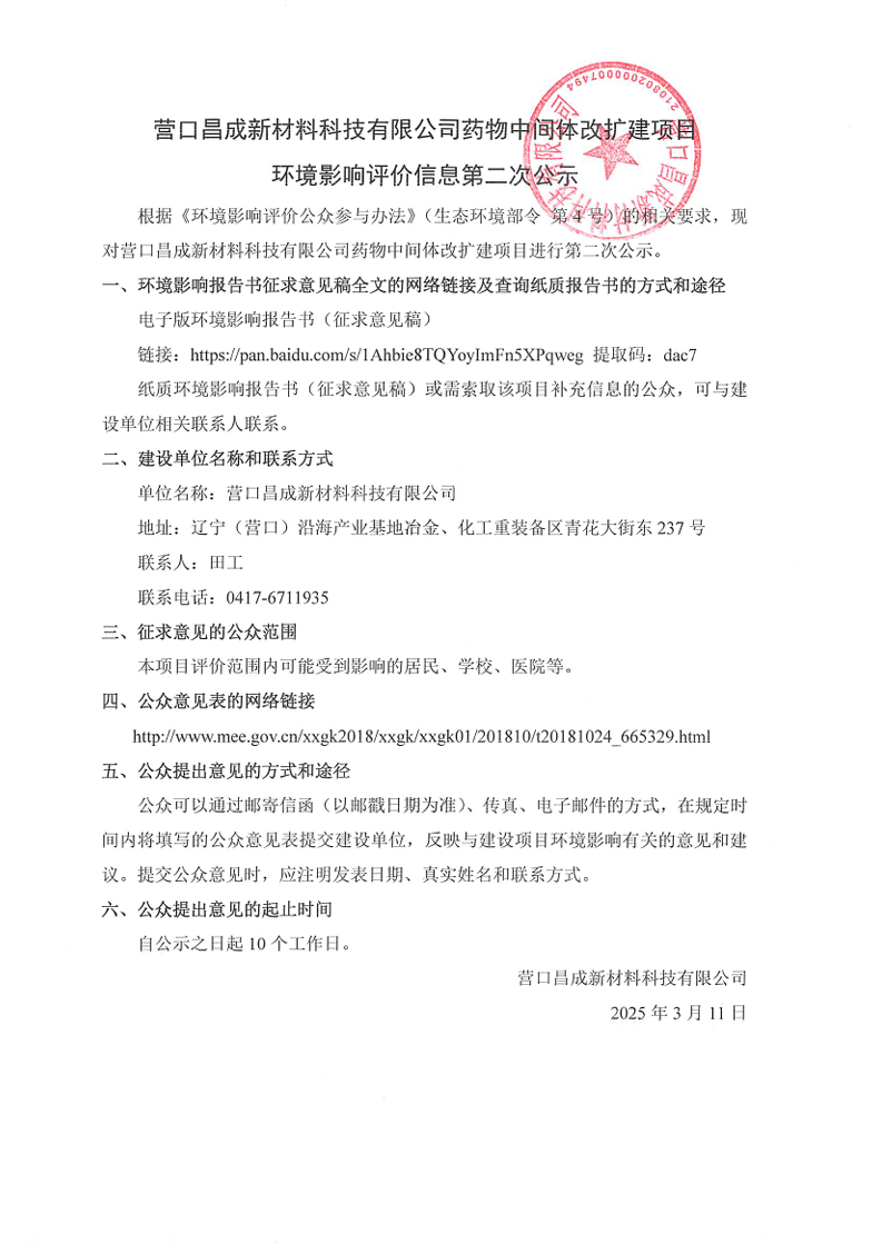 營口昌成新材料科技有限公司藥物中間體改擴(kuò)建項(xiàng)目環(huán)境影響評價(jià)信息第二次公司